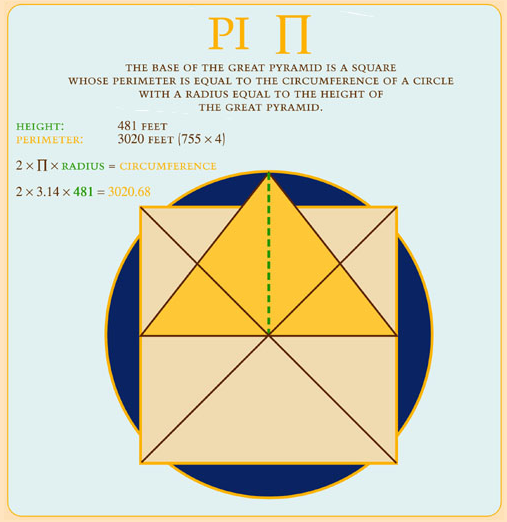 - The Perimeter to Equatorial Circumference: If you take the perimeter of the base (3,023.1 feet) and multiply it by 43,200, you get the equatorial circumference 24,734 miles.