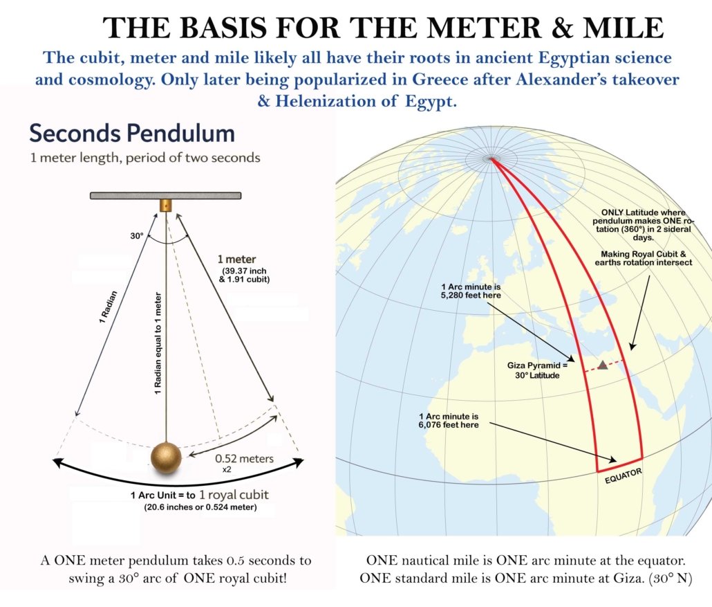 So in a single day, there are 43,200 pendulum swings, when using a pendulum with an arc of ONE royal cubit. THIS is most likely why the Egyptians used this scale factor for the pyramid. (And evidence that the Meter is very old). Because if we want turn that same pendulum into a round circle mirroring or scaling the earth, with a obvious and simple radius of ONE METER (the length of the pendulum swing), then now our circumference becomes 2 r OR ~12 royal cubits. Which means the Egyptians used a type of radian system in their math. With 1 METER = 1 RADIAN, and 1 pendulum arc = ONE CUBIT. So then ONE CUBIT = 2 seconds, and to scale that up to a “real day” of 86,400 seconds (60sec*60min*24hr) we use the ratio/scale factor of 1:43,200. So the take away is: