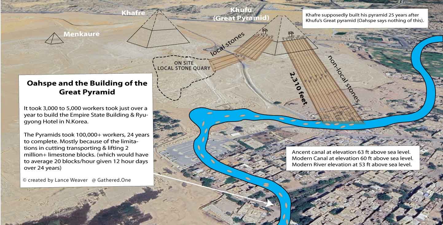 The last detail from Oahspe we will cover here is the nature of the ramps, as many have suggested assorted layouts. Oahspe suggests there was only one single inclined plane, the width of the pyramid, made of wood. This is also our best indication that a ‘length’ is NOT a cubit but literally about the length or height of a man, which we can assume from mummies was around 5’1″ to 5’6″ (we compute 5’3″ or 63″), which when times by 440 as the text says, gets us a plane about the length of what it would take to get to river elevation of 65′ above sea level. (2236 to 2420 feet, both of which work given the elevations).