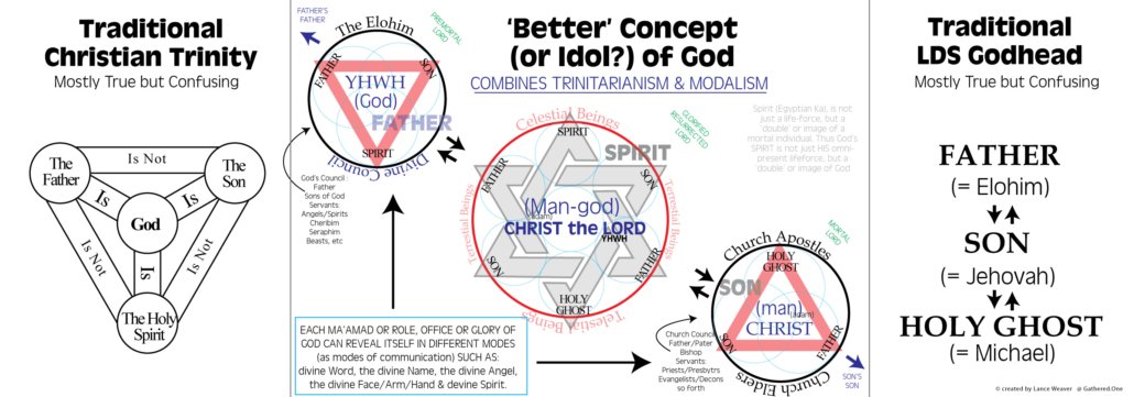 [TLDR SUMMARY: THE ORIGINAL GOVERNMENT OF GOD WAS SIMPLE. A KING’S COURT (PHAROAH’S COURT). FATHER-SONs-SERVANTs. Each of these echelons had multiple ‘modes’ of communication. Divine Presence, divine Word, the divine Name, the divine Angel, the divine Mantle, the divine Face/Arm/Hand/etc and finally the divine Spirit (or communal/astral projection). Its that simple. All are ONE COURT. Each act in the name of the KING YHWH. With the mixing of Egyptian (modalism-ish) & Babylonian/Greek (trinitarian-ish) cultures these concepts became convoluted. And occasionally used wrong. Especially in how Spirit & Word or other ‘modes of communication’ are mixed up or convoluted with the BEINGS who send them. Specifically SPIRT or HOLY GHOST being convoluted with Father, Son or Servants. ‘Modes‘ are not beings or persons or personages, but are sometimes convoluted as so (Especially divine Spirit). More importantly, Because the titles are tied to glories or levels of the divine court. (father-son-servants or celestial-terrestrial-telestial). Then if you try and tie father or son or spirit to a personage you will confuse the terms after they ascend or condescend. (such as Christ being father AND son). The terms are fluid, and must be interpreted as changing fluid titles. This is why the Theosis or ascension/condescension of god (the gods) was only taught in the inner court, because the uninitiated would confuse the terms when they didn’t understand their fluid nature.]