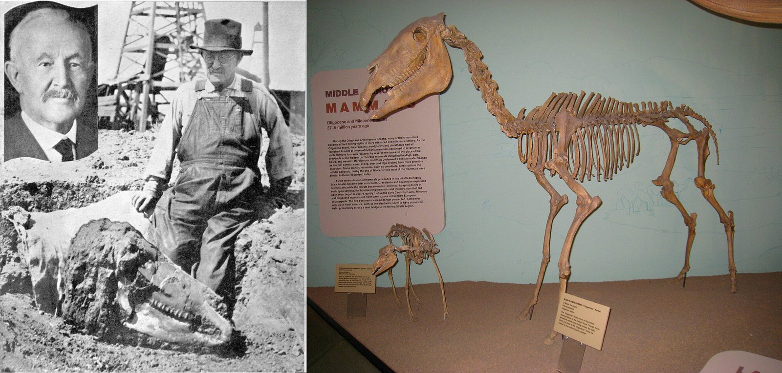 Paleontologist Charles H. Sternberg collecting a large Pleistocene horse skull in 1926-27 from tar pits at McKittrick oil field, just west of Bakersfield, California.