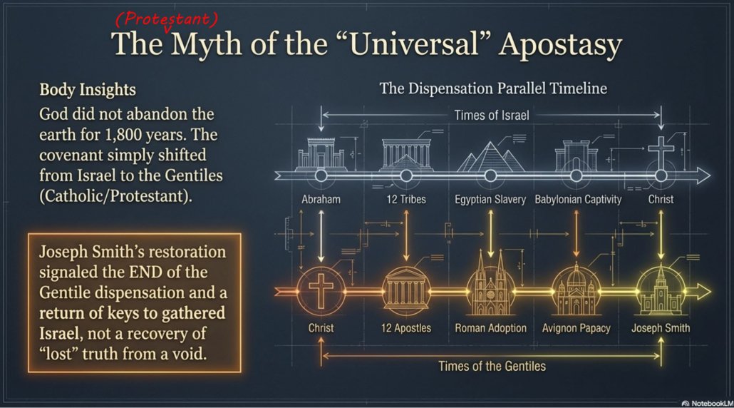 In other words, despite their incredible wickedness, God allowed Israel to be his ‘church‘, Messenger or archetype of how heaven operates to the world for a full 2000 years from Abraham to Christ. After Christ, only Israel fell into apostasy (was rejected by God) as the gospel and job of being Jehovah’s church or archetype passed to the Gentiles and Catholic Church. Joseph Smith’s ‘restoration’ heralds the message that the priesthood and truth is about to be taken from the gentiles (as they apostatize/are rejected) and given back to gathered Israel (Middle Eastern & Latin peoples). In the end, the renewal of the covenant and religious priesthood keys, is part of a repeated pattern wherein the God of Israel or the “heavenly church” takes turns establishing new covenants and symbolic systems with each of the world’s peoples at assorted key times and seasons of human history. (And has nothing to do with truth, priesthood, the gospel or church being taken completely from the earth.)