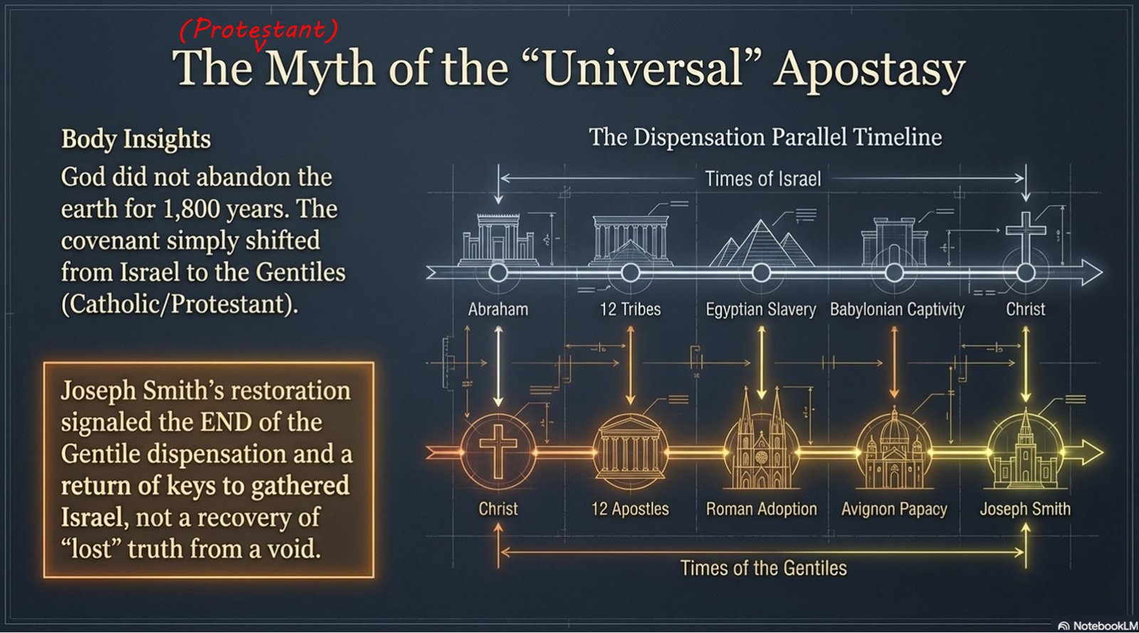 In this article I hope to unravel some of the contradiction found in many versions of the LDS “Great Apostasy” doctrine, adopted from the popular protestant views by early church leaders during Joseph Smith’s time. Instead of ‘great’ or universal apostasy, LDS scriptures actually teach a unique blend of dispensationalist/covenant theology which means that instead of a complete loss of priesthood or rejection of God’s favor on, and covenant with, his church (from 33 AD-1820 AD); only Israel and the Jewish-Christian Church with its distinct promises & functions was in fact rejected & destroyed in the centuries after Christ. God’s covenant with the Gentiles remained intact through the Catholic & Protestant churches until the end of their dispensation which was signaled by the prophetic & restorative role of Joseph Smith. Which role was to restore ISRAEL and the Jewish-Christian Church with its distinct promises & functions.